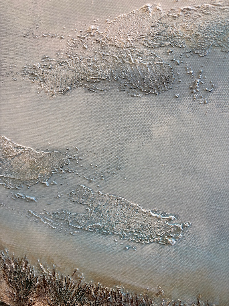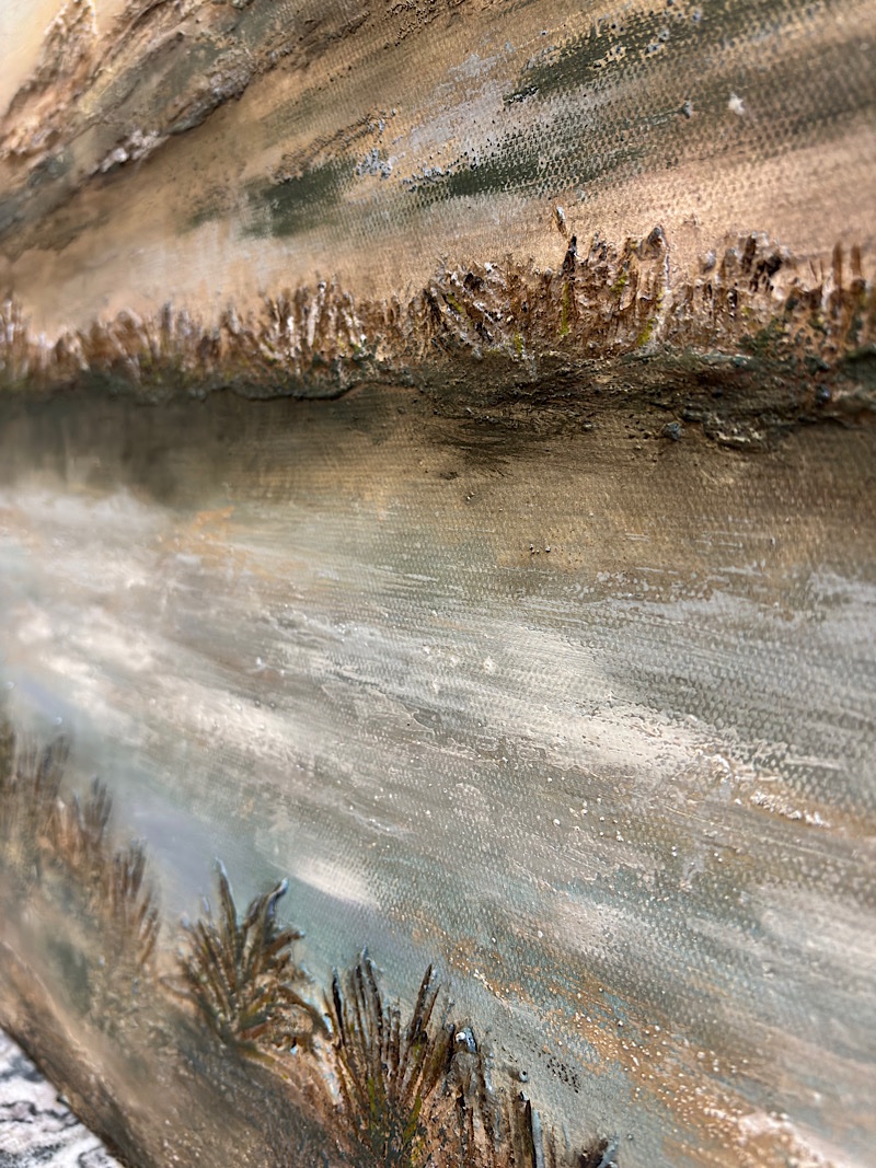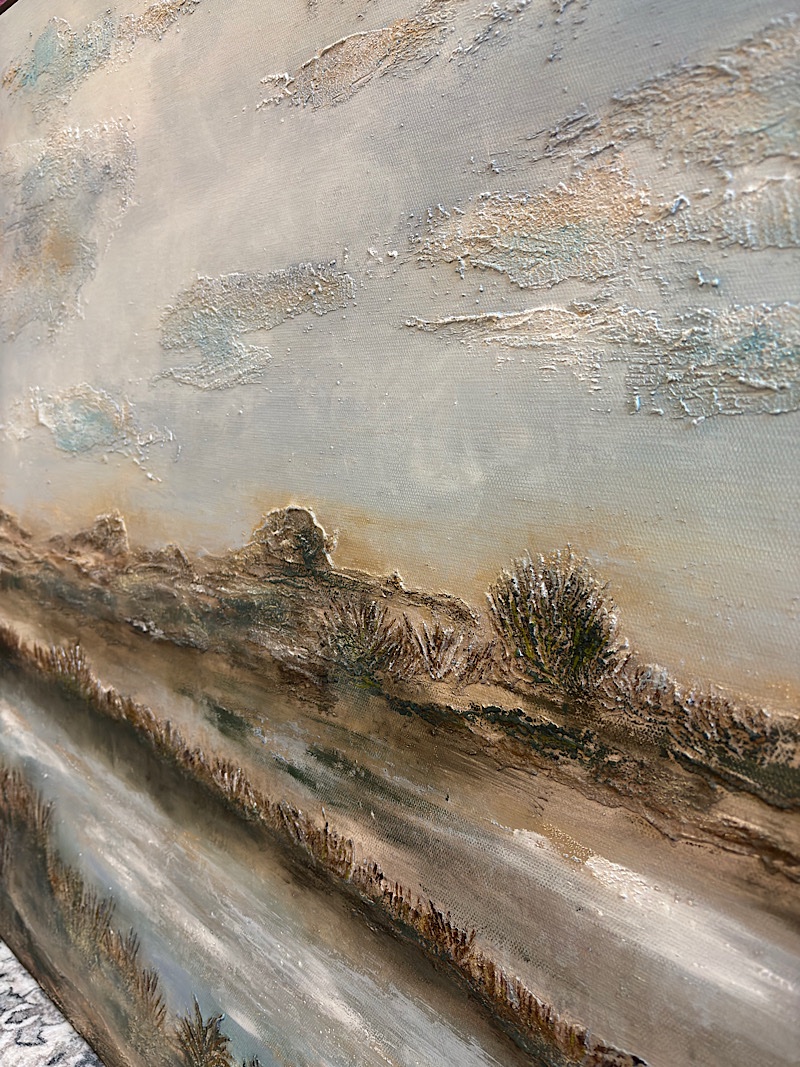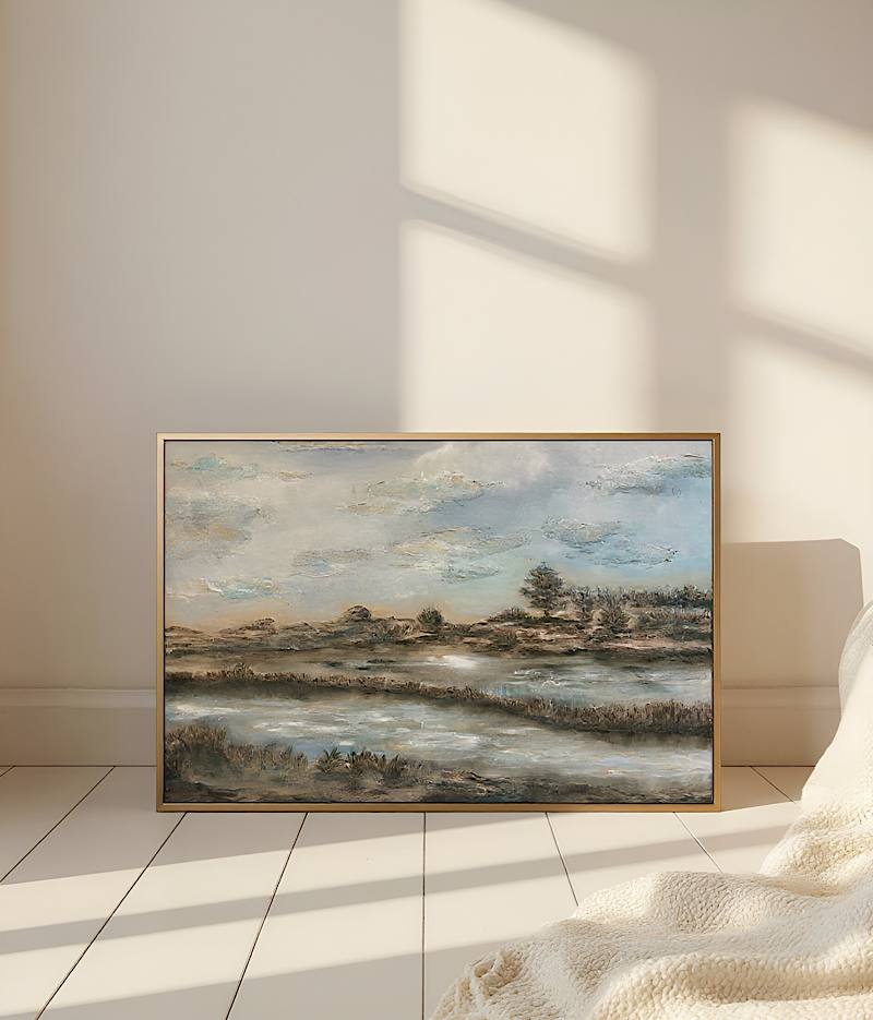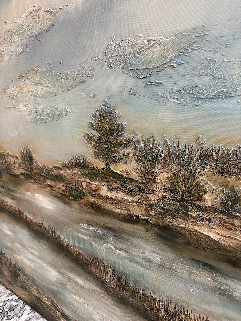Obraz został wykonany ręcznie na wysokiej jakości płótnie malarskim o wymiarach 120×80 cm. Wyraźna struktura powierzchni powstawała etapami — farby były nakładane warstwowo, dzięki czemu pejzaż nie jest płaski. Światło delikatnie zatrzymuje się na wypukłościach, zmieniając odbiór pracy w zależności od pory dnia.