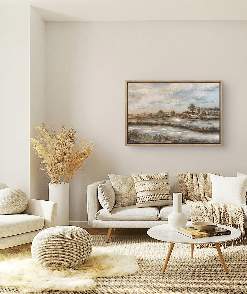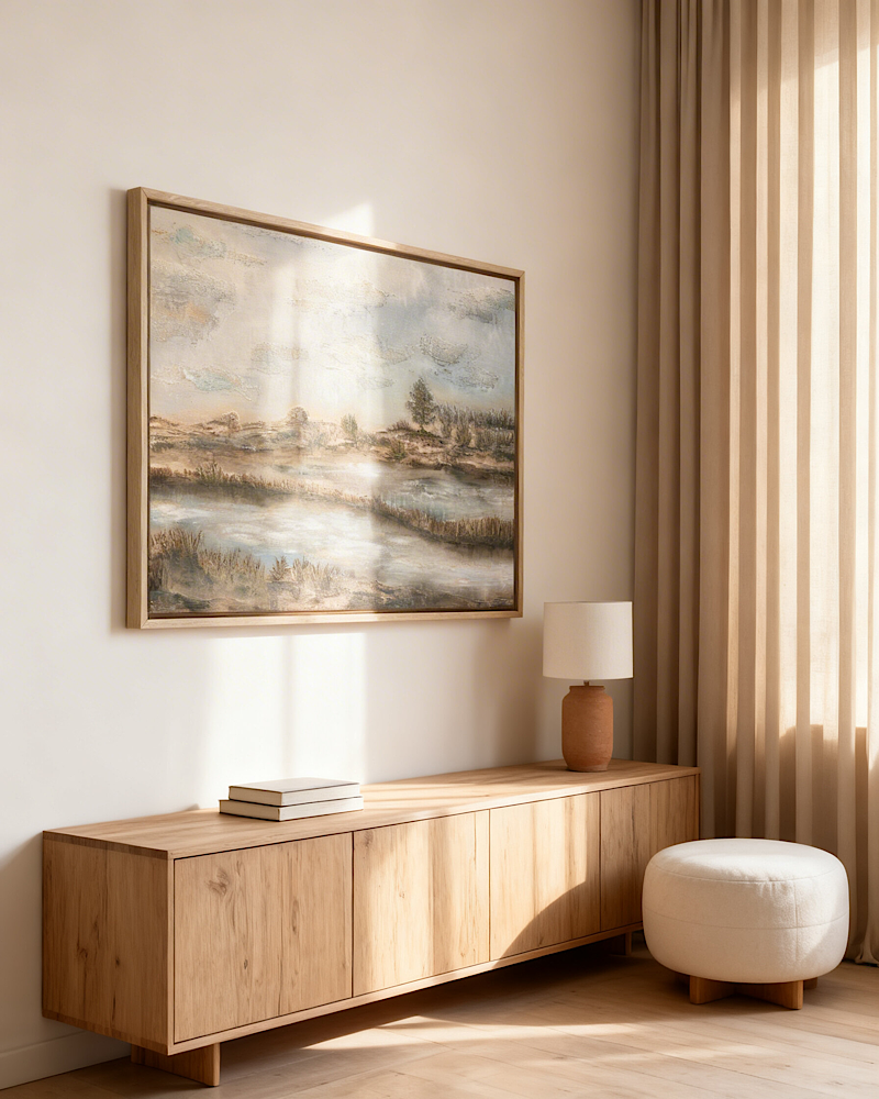 Pejzaż abstrakcyjny dobrze odnajduje się w wielu przestrzeniach: salonie, sypialni, gabinecie czy strefie odpoczynku. Delikatna kolorystyka nie przytłacza pomieszczenia, a jednocześnie nie ginie na ścianie. Obraz porządkuje przestrzeń wizualnie — szczególnie w nowoczesnych, jasnych wnętrzach, gdzie często brakuje elementu ocieplającego atmosferę.