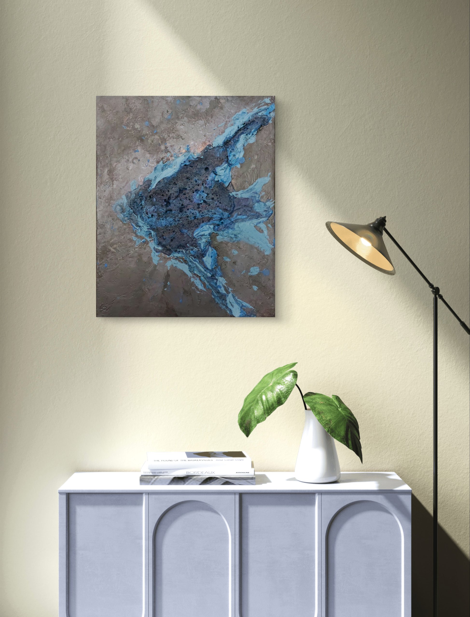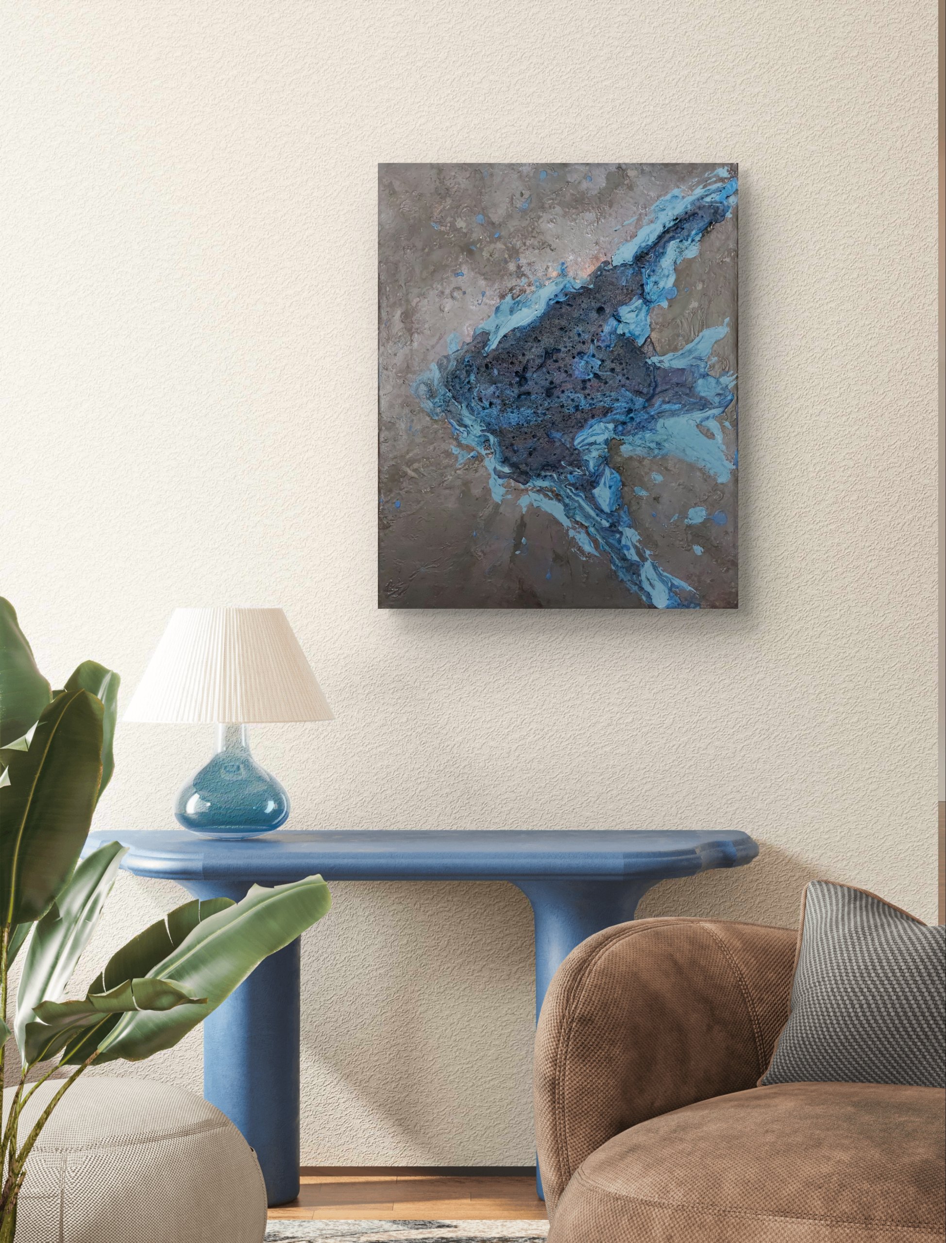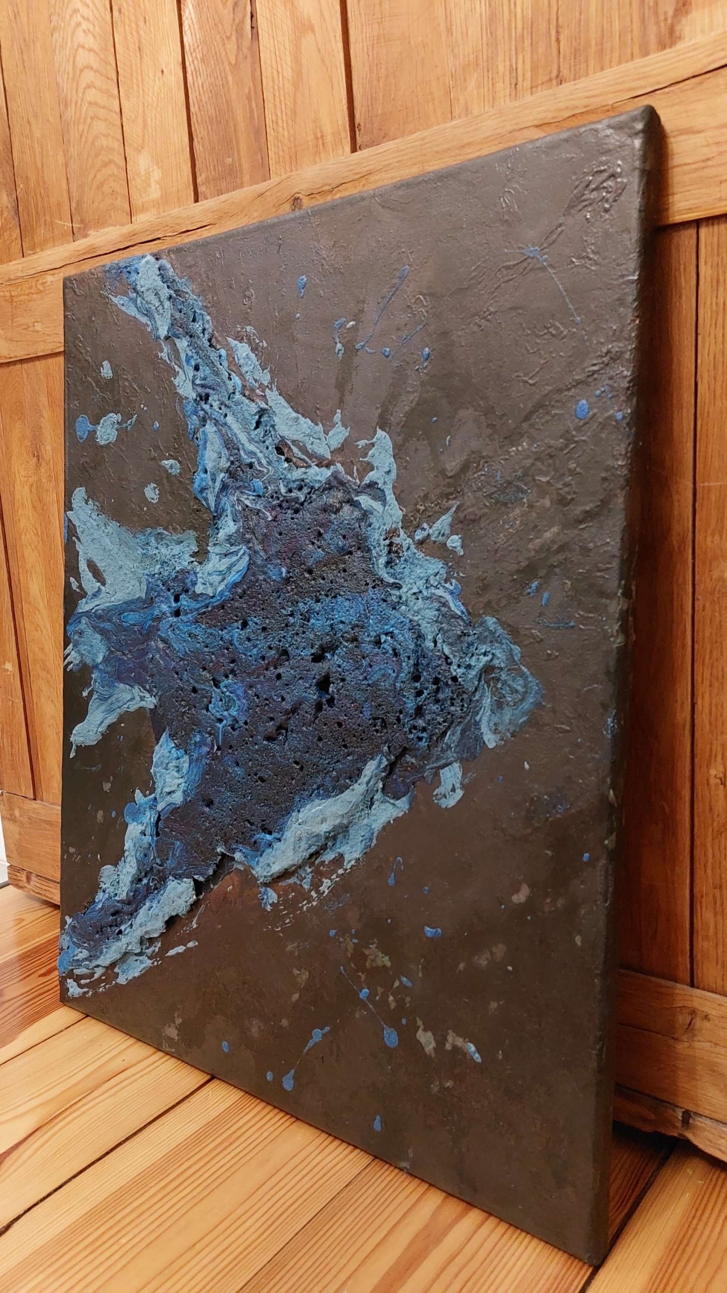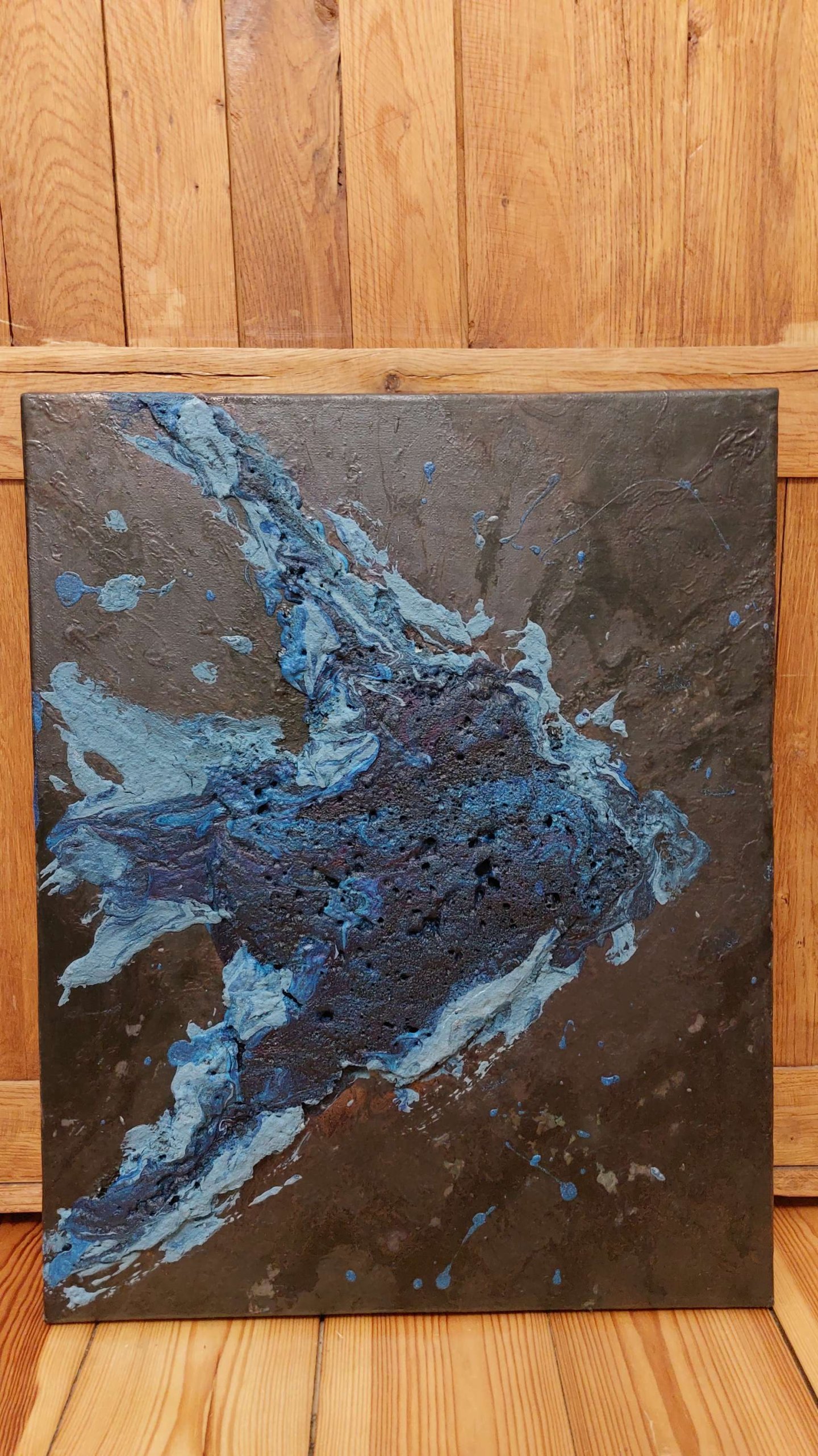 Obraz strukturalny “Skalar” to obraz niewielkich rozmiarów utrzymany w odcieniach niebieskiego i czerni.
